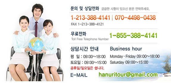 한우리여행사 / 앨에이 LA 관리자 여행사 0 1 2018.04.11 02:42 관광 항공권 편안하고 즐거운 여행,한우리와 함께 하세요.미국내관광 한국관광 213-388-4141 엘에이 한인타운 코리아타운 Los Angeles 전화걸기 1 빠르고 편리한 온라인 업소록 '한인업소록닷컴' (HaninUpsorok.com, 한인업소록.com)