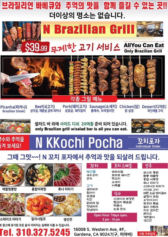 꼬치 포차/가디나 Gardena USR 클럽 주점 0 0 2024.06.14 19:40 포장마차 주점 한식안주 꼬치및 Brazilian Grill 310-327-5245토랜스 Torrance 전화걸기 0