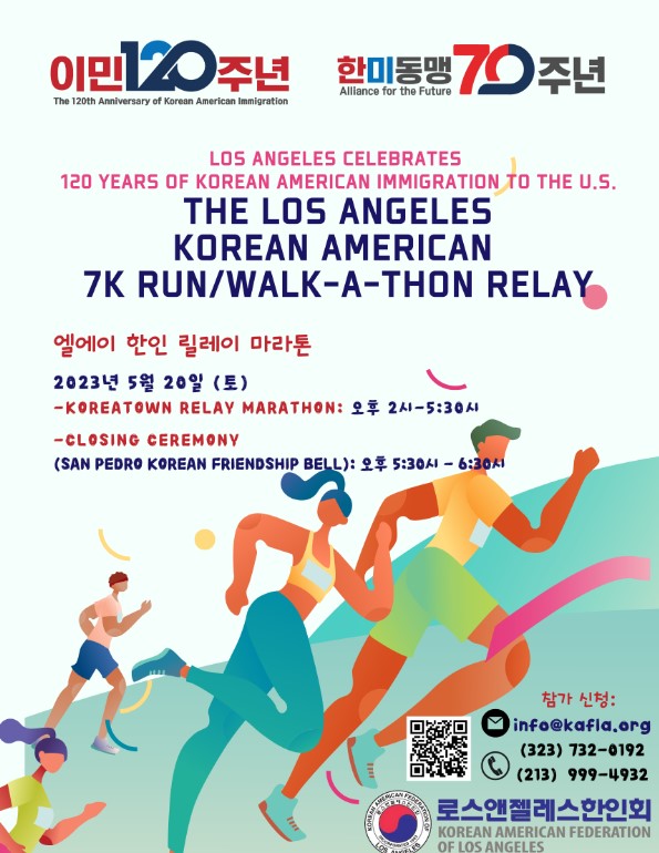LA한인회에서는 미주한인이민120주년이자, 한.미동맹 70주년이 되는 올해 2023년도를 우리 한인들이 기억하고 함께 기념하도록, 남녀노소 누구나 참여할 수 있는 마라톤행사를 개최합니다.