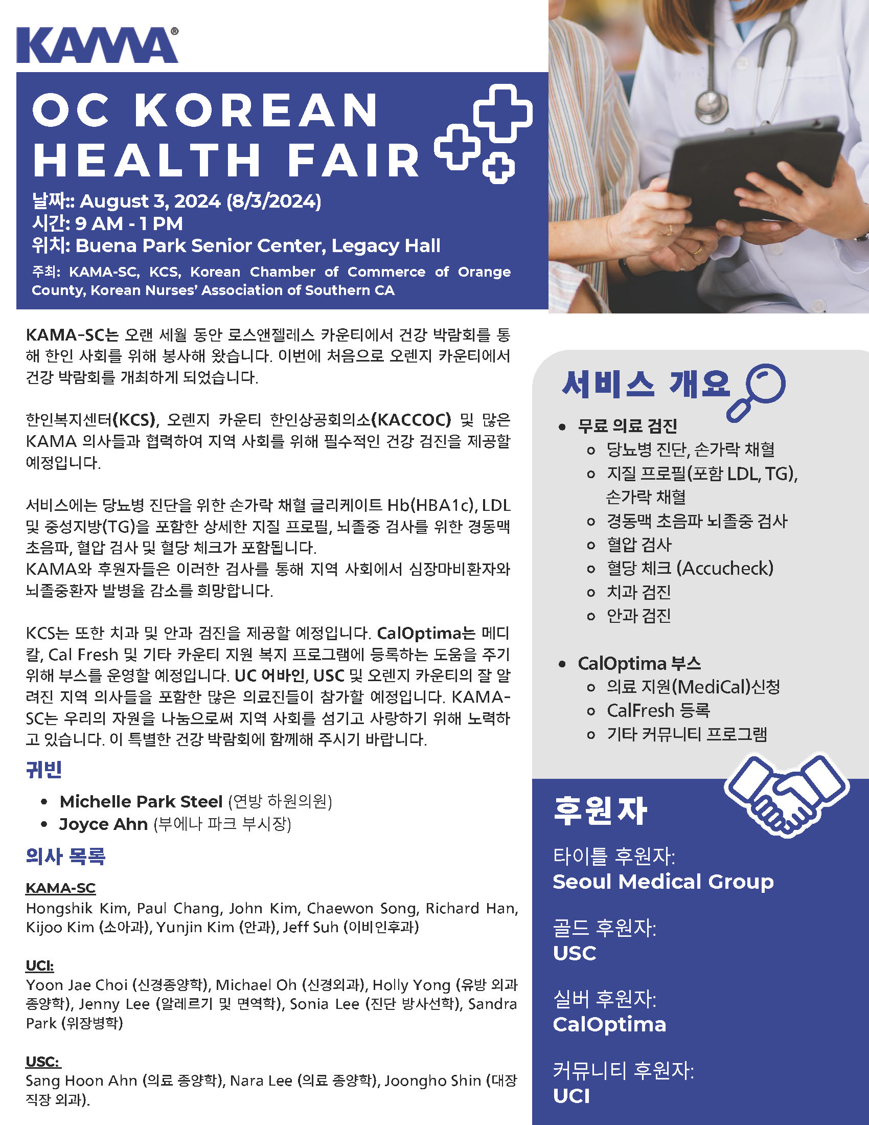OC지역 무료 의료 검진/8월3일.오전9시-오후1시 USR 지역소식 0 724 2024.08.02 12:44 #업소록닷컴 Upsorok.com #생활정보 TheKoreatown.com #부동산 알나무 Rtree.com#미국여행 #미국생활 #엘에이 #한인타운 #코리아타운 #오씨 #OC #오렌지카운티 #LA