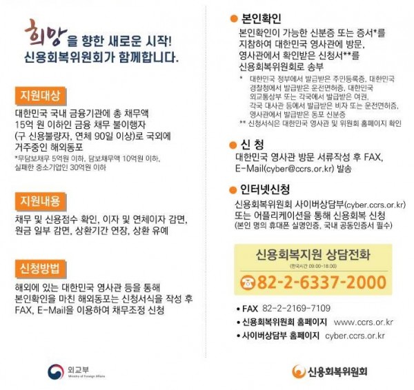 재외동포 신용회복 지원제도 USR 톡톡방 0 1053 2023.10.27 16:55 전화기 컴퓨터로 보는 업소록, 지역 생활정보 -한인업소록닷컴- (업소록.com, 한인업소록.com, Upsorok.com, HaninUpsorok.com)