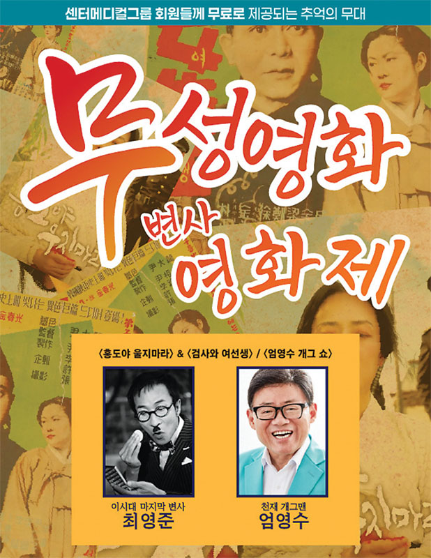 센터메디컬그룹 측은 “최영준 변사는 전통 변사 특유의 현장감 넘치는 목소리 연기와 스토리텔링으로 관객들에게 생생한 감동을 전할 예정”이라며 “또한 국민 개그맨 엄영수가 출연해 유쾌한 개그 공연으로 무대에 즐거움을 더하게 된다”고 밝혔다.