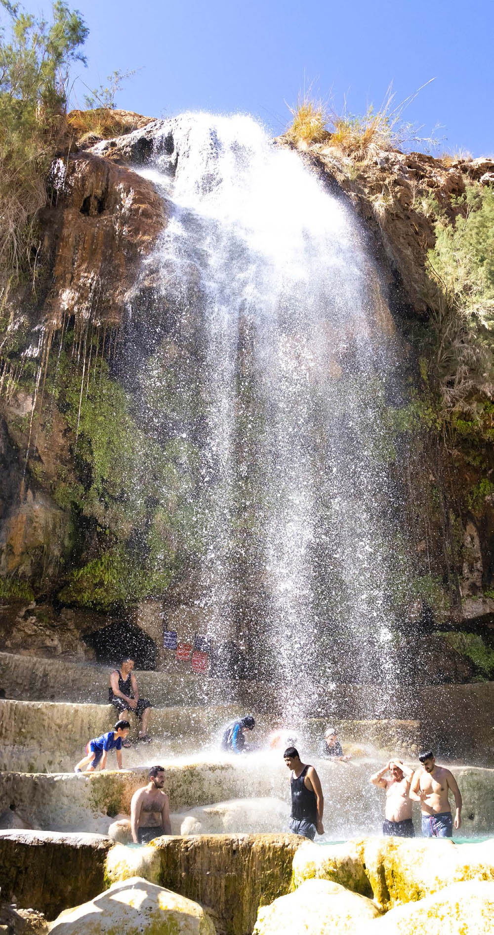 마인 온천은 사해에서 언덕길을 한참을 올라간 뒤 다시 경사진 길을 한참 내려가야 한다. 노천 석탄 채굴장으로 들어가는 느낌이다. 화성처럼 돌만 가득한 풍경은 다른 세상 같다. 그리고 갑자기 화려한 꽃과 녹색 숲이 맞이하는 신세계가 나타난다. 이곳의 해발은 마이너스 264m다.