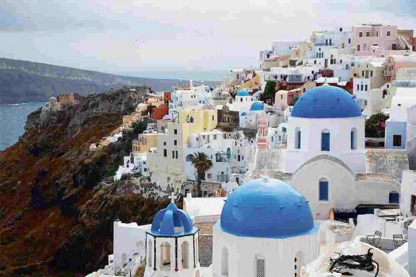 산토리니의 독특한 푸른색 지붕과 하얀 벽돌 집 들. 에게 해의 코발트 빛 색깔과 맞물려 감동적인 한 폭의 그림을 자아낸다.